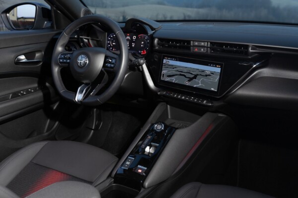 No interior o modelo ganha ainda mais independência frente aos seus irmãos de plataforma, por lá o requinte é maior e o DNA da montadora italiana se faz mais forte. A central multimídia de 10,25 polegadas fica em posição mais baixa, sem se destacar no painel, angulada para o motorista como é de praxe nos carros da Alfa Romeo. Com bons níveis de acabamento e muito soft touch, o cockpit tem ainda painel de instrumentos digital e um console elevado que concentra funções de câmbio e carregador por indução.