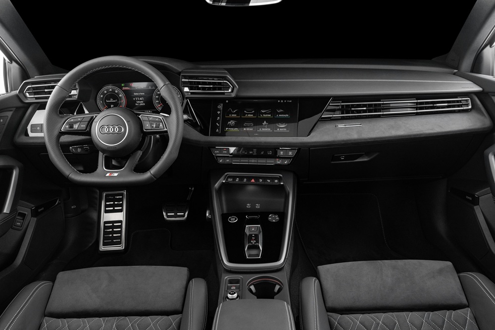 Entre os itens de série estão bancos elétricos e aquecidos e um ar-condicionado automático de três zonas. O Pacote S Line interior, que antes era opcional, agora vem de série e inclui bancos esportivos em couro sintético com logotipo S Line, pedaleiras de alumínio, teto revestido em tecido preto, e volante com laterais em couro perfurado e costuras contrastantes. O sistema de som Audi Sound System com 10 alto-falantes (180 W) e o Audi Virtual Cockpit Plus com visor de 12,3 polegadas completam a experiência, juntamente com a direção dinâmica progressiva.
