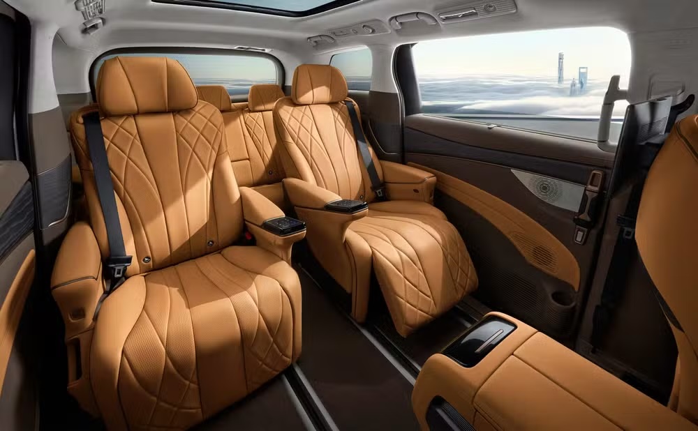 A Denza D9 é uma van que se destaca pelo luxo a bordo, oferecendo configurações comparáveis às classes executivas de aeronaves. As poltronas da segunda fileira, por exemplo, contam com aquecimento, ventilação, funções de massagem e ajustes elétricos, incluindo apoio para as pernas. E o conforto e espaço a bordo são garantidos por uma configuração peculiar de 2+2+3 assentos, totalizando sete lugares.