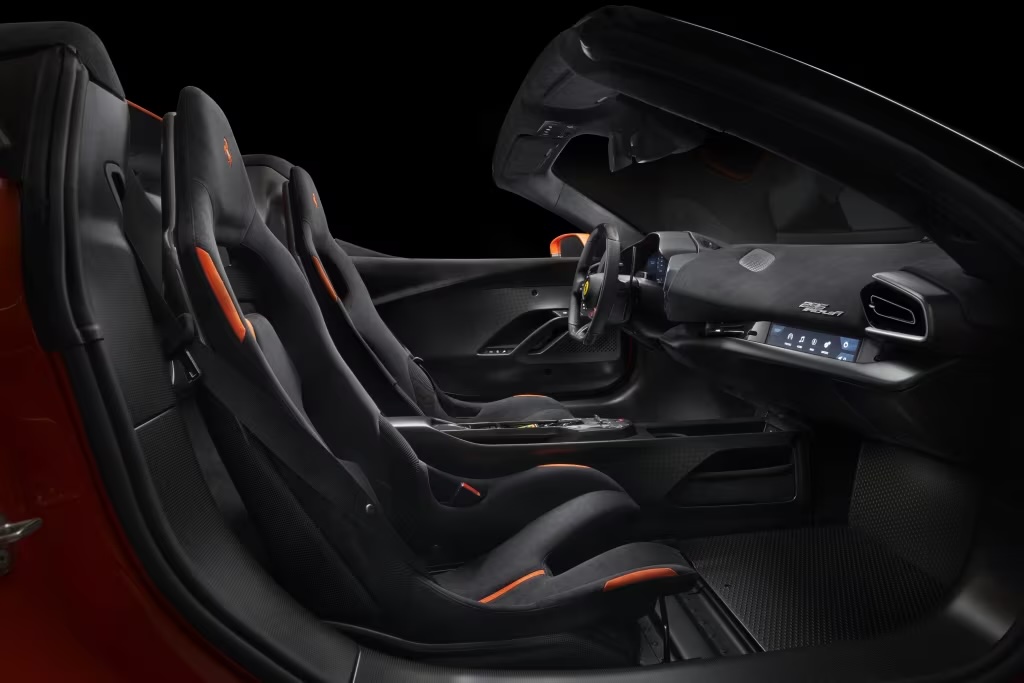 O interior mantém o luxo das versões convencionais, mas com uso mais extensivo de fibra de carbono e Alcantara. O quadro de instrumentos é composto por uma tela digital, e há uma modesta tela horizontal à frente do passageiro que funciona mais como um segundo painel de instrumentos do que como central multimídia tradicional.
