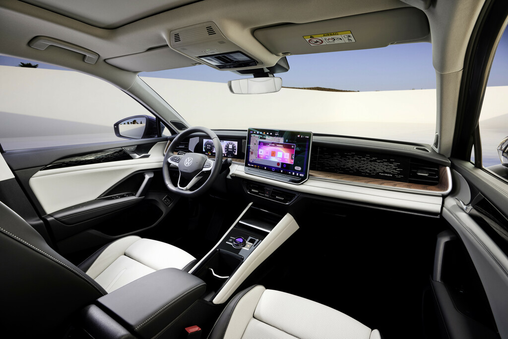 O interior do Tayron representa um salto qualitativo para a Volkswagen. Inspirado na família de carros elétricos ID, o painel adota um design minimalista com três telas: um painel de instrumentos digital de 10,25 polegadas, uma central multimídia de até 15 polegadas e uma tela adicional para o passageiro, ainda não habilitada durante a apresentação em Paris.